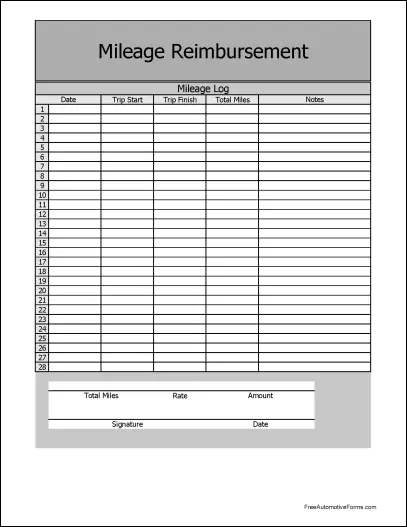 FreeAutomotiveForms' free "Fancy Numbered Row Mileage Reimbursement Form" form is associated with the following keywords: Log, Automotive, expense report, mileage, reimbursement, payment, fancy, numbered row.