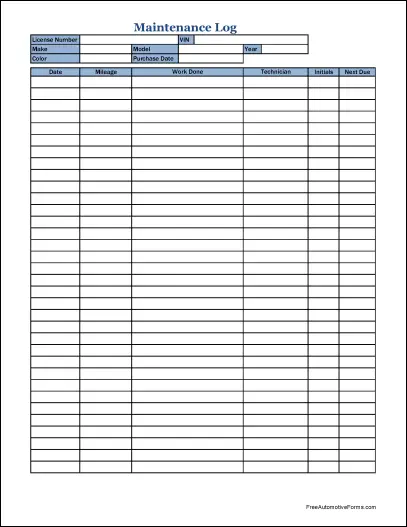 FreeAutomotiveForms' free "Detailed Automotive Maintenance Log (Long)" form is associated with the following keywords: Vehicle Maintenance Log, Free Log Form, Equipment, Service Log.
