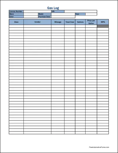 FreeAutomotiveForms' free "Detailed Gas Log (Tall)" form is associated with the following keywords: Driving, Accounting, Free Log Form.