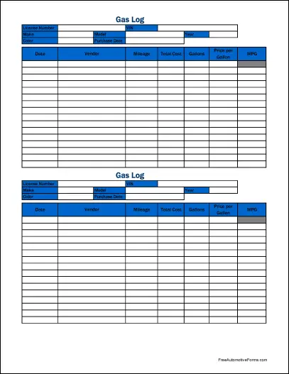 Form Description: Whether you have a single company car or a fleet of delivery trucks, you need to know how much you're spending on gas. Fuel efficiency and spending are easy to track with our gas log. The detailed version includes extensive vehicle information such as license number, VIN, purchase date, make, model and year, as well as an itemized transaction list. The list includes fields for the date, vendor, current mileage, amount spent, gallons purchased, price per gallon, and the MPG since the last fill up. In the Excel edition, the price per gallon and MPG fields are computed automatically. The forms are in half-page landscape format, and the document is in portrait format.