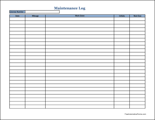 FreeAutomotiveForms' free "Simple Automotive Maintenance Log (Wide)" form is associated with the following keywords: Vehicle Maintenance Log, Free Log Form, Equipment, Service Log.