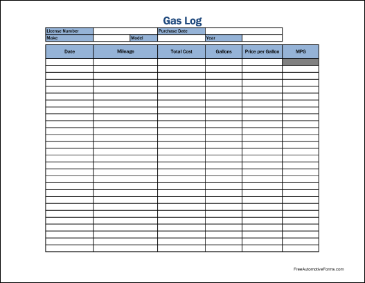 Form Description: Whether you have a single company car or a fleet of delivery trucks, you need to know how much you're spending on gas. Fuel efficiency and spending are easy to track with our gas log. The basic version includes vehicle information such as license number, purchase date, make, model and year, as well as an itemized transaction list. The list includes fields for the date, current mileage, amount spent, gallons purchased, price per gallon, and the MPG since the last fill up. In the Excel edition, the price per gallon and MPG fields are computed automatically. This form is in full-page landscape format.