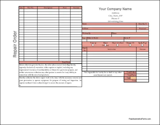 FreeAutomotiveForms' free "Simple Automotive Repair Order" form is associated with the following keywords: automotive, cars.