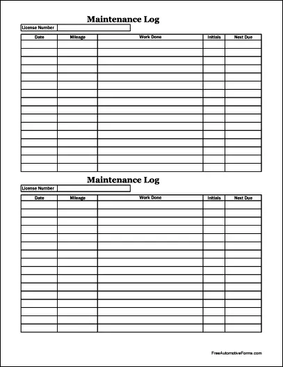 Form Description: Your fleet is an important part of your business. The cars and trucks that keep you moving are essential to providing the goods and services that your customers want. Make sure that they stay in peak condition with the help of our automotive maintenance logs. Our simple log includes the vehicle's license number as well as a table for all of your service entries with the date, mileage, the type of work, the technician's initials, and when the vehicle is next due for servicing. This version is formatted for easy duplication for your convenience. The forms are in half-page landscape format, and the document is in portrait format.
