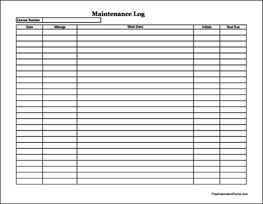FreeAutomotiveForms' free "Easy-Copy Simple Automotive Maintenance Log (Wide)" form is associated with the following keywords: Vehicle Maintenance Log, Free Log Form, Equipment, Service Log.