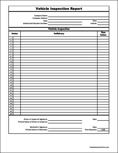 FreeAutomotiveForms' free "Numbered Vehicle Inspection Report with Total Time" form is associated with the following keywords: automotive, driver, inspection, vehicle .
