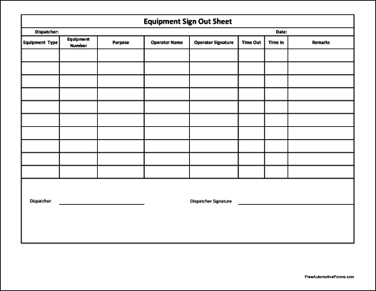 FreeAutomotiveForms' free "Basic Equipment Sign Out Sheet (Wide Row)" form is associated with the following keywords: automotive, sign out, equipment, equipment sign out, basic, wide row.