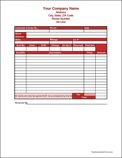Form Description: Designed for those selling vehicles or automotive parts. Includes information on the customer and vehicle and a section for itemized parts, services, or multiple vehicle listings. This form is in full-page portrait format.