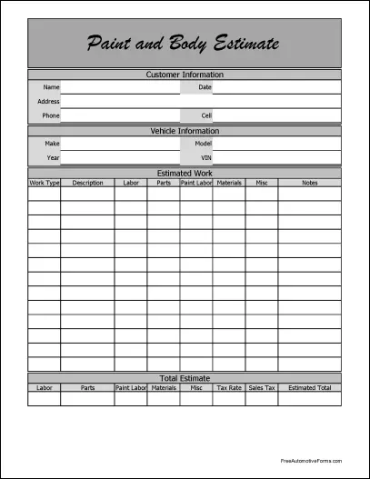 FreeAutomotiveForms' free "Wide Row Paint and Body Estimate Form" form is associated with the following keywords: estimate, paint, body, automotive, service, basic, wide row.
