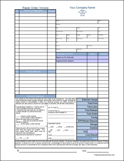 Form Description: Designed for automotive repairs and maintenance. Includes space for customer contact information and itemized costs for parts, paint &refinishing, and labor. Also includes suitable disclaimers and notices. This form is in full-page portrait format.