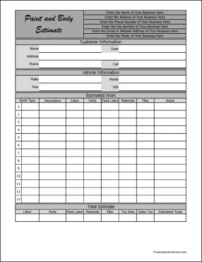 Personalized Fancy Wide Numbered Row Paint and Body Estimate Form