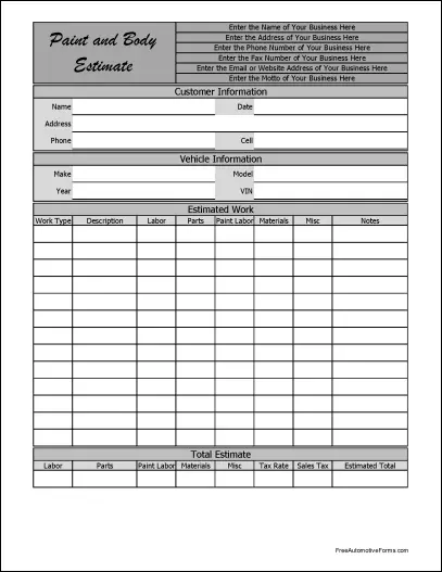 Personalized Fancy Wide Numbered Row Paint and Body Estimate Form