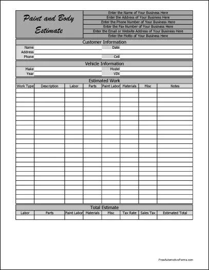 Personalized Fancy Paint and Body Estimate Form